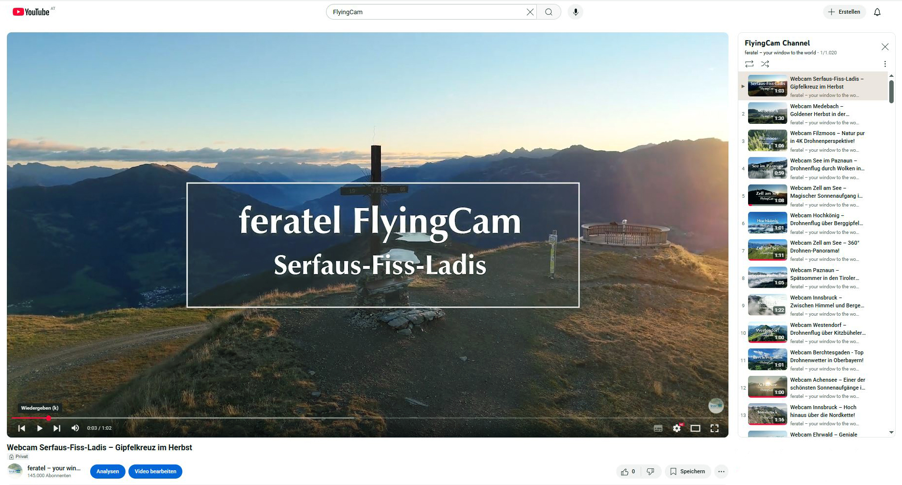 All FlyingCams can be found at any time at www.feratel.com, on the feratel webcams app and on YouTube!